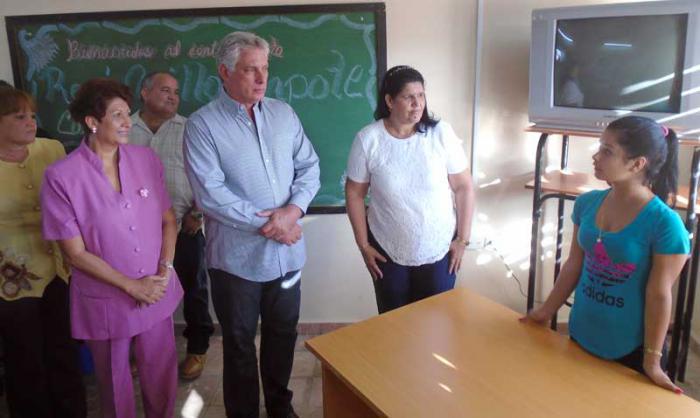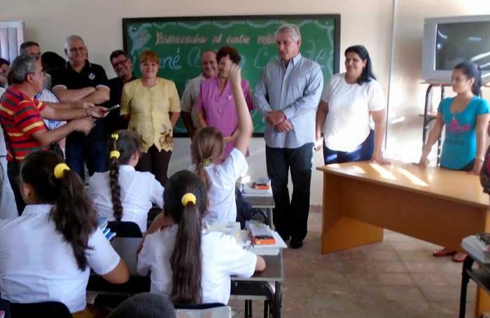 Accompanied by provincial authorities and Education Minister Ena Elsa Velázquez, Diaz-Canel asked several students their opinion about the new school, and how they had previously traveled to class.