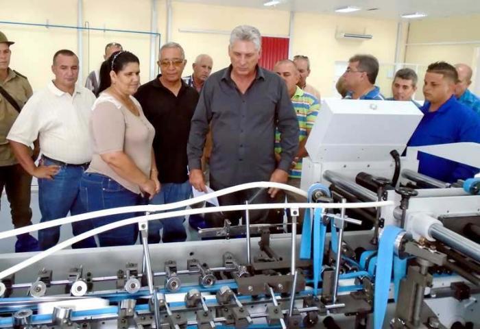 During a tour of the facility, Díaz-Canel inquired about the labor force that will operate the plant, the technology installed thus far and to be incorporated in the future, and the characteristics of the packaging to be produced for various enterprises within the BioCubaFarma group.
