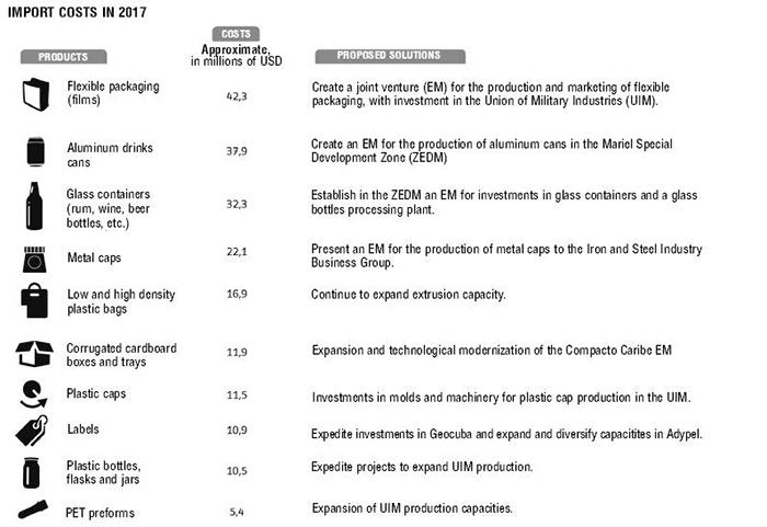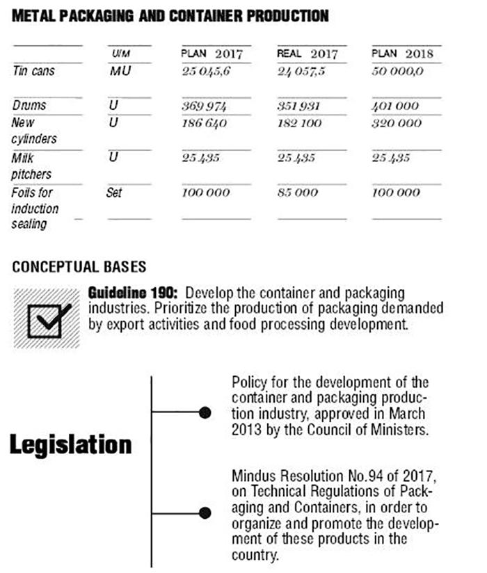 The principles of the island’s packaging policy, approved in 2013, based on a comprehensive vision, promote the manufacture of items destined for the export and food processing sectors, the sale of construction materials, as well as the progressive substitution of imports.