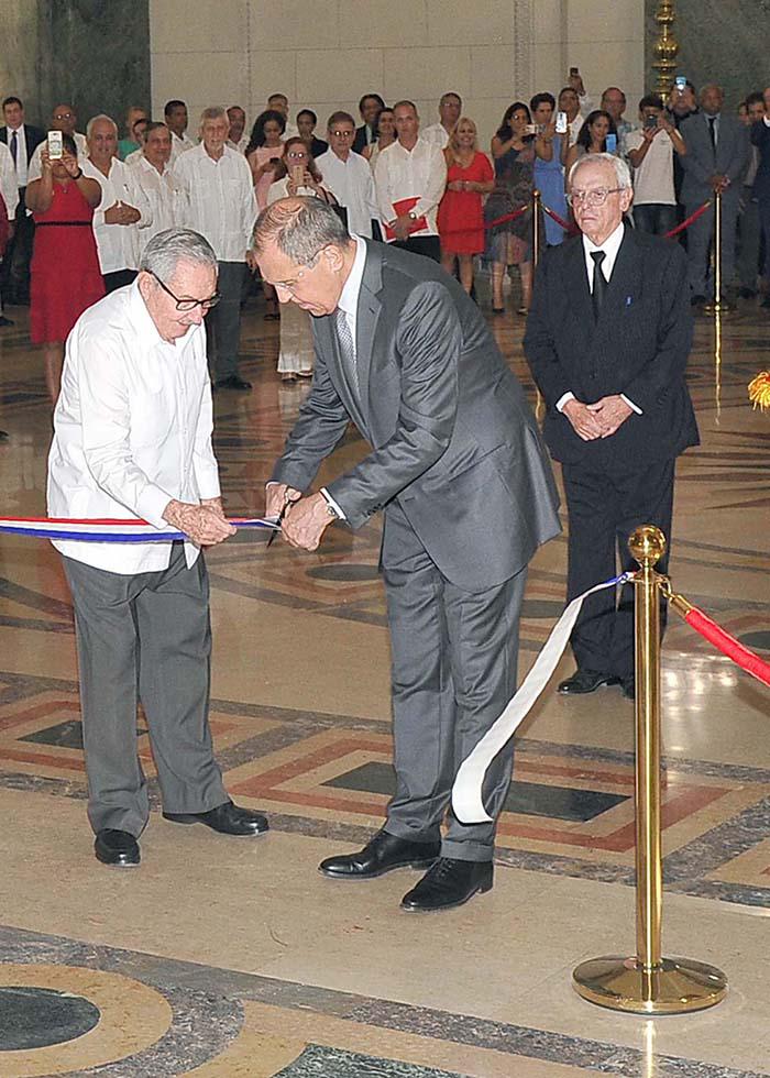 In his remarks, Russian Foreign Minister Lavrov emphasized the significance of the Capitol for all generations of Cubans, the sacred site of the Tomb of the Unknown Mambi; as well as its importance as the seat of National Assembly of People’s Power, which directs its efforts toward the development of the country. "Cuba is a faithful friend and strategic partner," he said. "Our relations have passed the test of time and today continue to develop intensely in all directions."He said that this joint project was a good example of cooperation between the two nations and reflects the friendship and mutual support that unite us.After the ribbon cutting, Raúl conversed with the restoration team and congratulated them for their excellent work on one of the Capitol’s most valuable pieces.