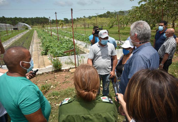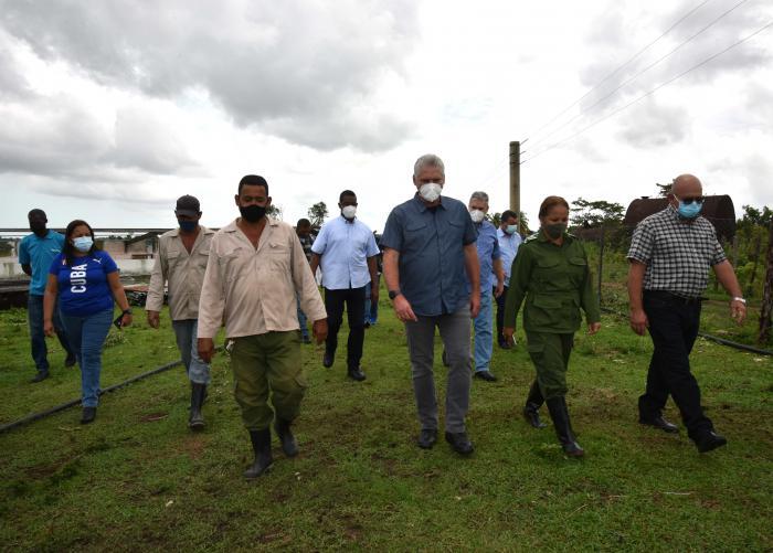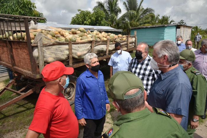 While touring areas of the Hermanos Barcón productive pole, one of the principal centers of this type in the province of Pinar del Río, the President conversed with producers and managers, insisting that work to launch a short-cycle planting strategy be prioritized, which will allow for availability of more produce, the immediate recovery of plantain fields, and increased harvests and replanting.