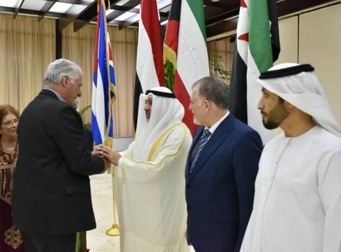 In the greeting -which was also attended by Prime Minister Manuel Marrero Cruz, as well as Cuban Foreign Minister Bruno Rodríguez Parrilla, both members of the Political Bureau- the Dean of the Group of Arab Ambassadors expressed to the leadership of the Caribbean country that they support Cuba and are with the nation in the fight against the U.S. blockade, while demanding the lifting of that siege and the exclusion of the largest of the Antilles from the fraudulent list of countries allegedly sponsoring terrorism.