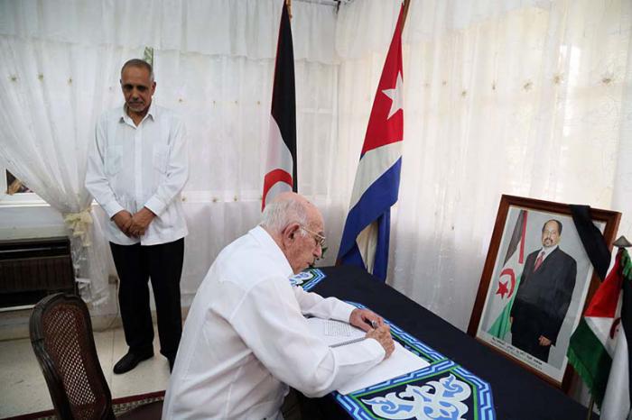 José Ramón Machado Ventura, a Council of State and Ministers vice president and second secretary of the Communist Party of Cuba, yesterday June 9, signed the condolences book at the Sahawari Arab Democratic Republic's embassy in Havana, on the occasion of the recent death of SADR President and secretary general of the Polisario Front, Mohamed Abdulaziz.