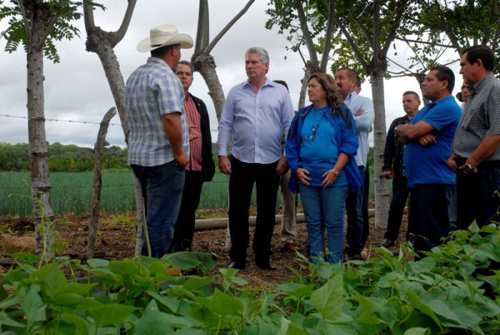 Joining Díaz-Canel were José Ramón Monteagudo Ruiz, Central Committee member and first secretary of the Party in Sancti Spíritus, and Teresita Romero Rodríguez, president of the Provincial Assembly of People's Power, in a meeting with young farmer Yoandry Rodríguez Porras, at the Nieves Morejón Cooperative located in Punta de Diamante, in the municipality of Cabaiguán. Rodríguez has been recognized for his accomplishments in diversifying the crops he raises.