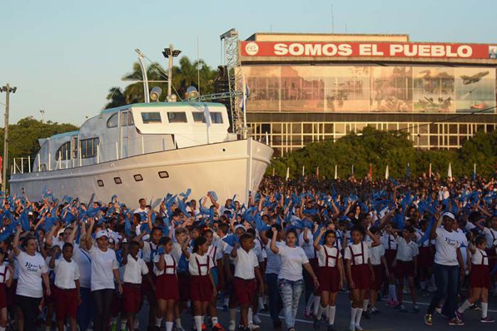 7:05.-More than 3,000 elementary school students accompany a replica of Granma yacht, leading the march.