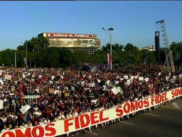 The last segment of the Havana population passes the review stand, shouting "Pa' lo que sea Raúl, para lo que sea," (For whatever may come, Raúl!), reaffirming their commitment to defending the Revolution, as a giant screen displays images of the historic leader of the Cuban Revolution, encouraging more chants of "I am Fidel!" There is no doubt, Fidel was in the Plaza this morning; Fidel is his people.