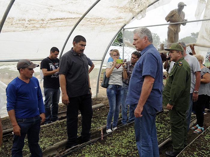 Ministry of Agriculture leaders and workers, in the municipalities of Pinar del Río and San Juan y Martínez, explained to the President the work being done to try and save more than 31,000 beds of tobacco seedlings damaged, and repair several dozen greenhouses.