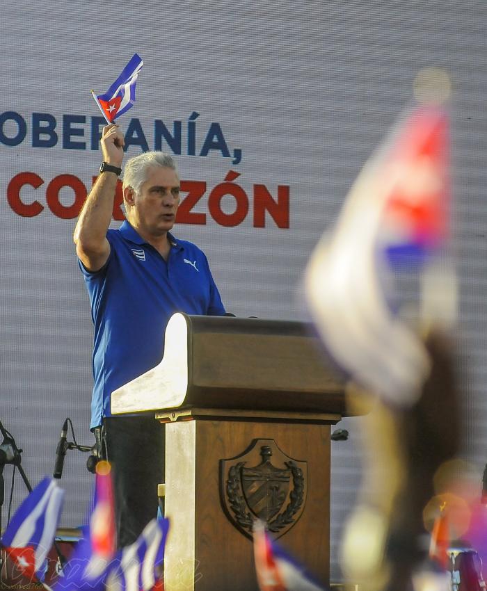 I do not judge, I do not condemn. I understand that the adversary's weapons are overwhelming, but on the side of the people, with the people and for the people, the Revolution continues to stand! (Applause and exclamations of: Long live the Revolution! Long live Diaz-Canel! Long live the people! Down with the Yankees! Down with the blockade!)