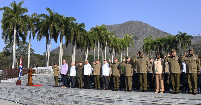 Early in the morning, in the mausoleum where the remains of the combatants of this guerrilla front, fallen in the war of liberation or deceased after the revolutionary triumph, rest, the National Anthem tore the silence of the mountain range and began a ceremony led by the First Secretary of the Central Committee of the Communist Party of Cuba and President of the Republic, Miguel Díaz-Canel Bermúdez; the Commander of the Rebel Army and founder of the front, José Ramón Machado Ventura, and the Commander of the Revolution and Vice Prime Minister, Ramiro Valdés Menéndez.
