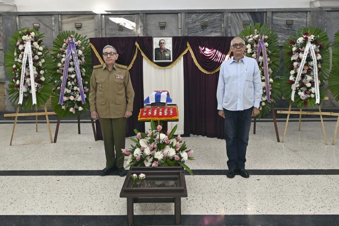 Army General Raúl Castro Ruz, leader of the Cuban Revolution, paid posthumous tribute, this Monday morning, to Reserve Major General Leonardo Ramón Andollo Valdés, whose ashes were exposed in the Veterans' Pantheon of the Colon Necropolis.