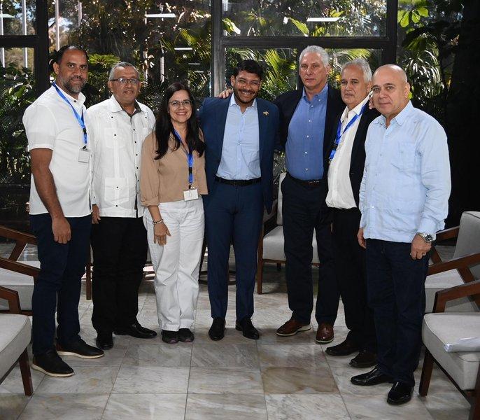 In the context of the third day of the 6th International Conference For the Balance of the World, the First Secretary of the Central Committee of the Party and President of the Republic, Miguel Díaz-Canel Bermúdez, held talks with several participants in this world meeting, which brings together delegates from 98 countries, at the Havana Convention Palace.