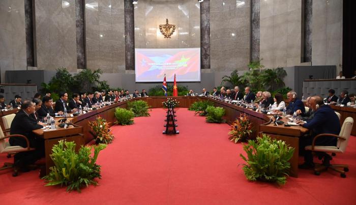 President Diaz-Canel characterized his counterpart as a close and outstanding friend, as a promoter of cooperation and brotherhood relations between the two countries: "Whenever we meet with our Vietnamese brothers, we are always reminded of the historic relations between Cuba and Vietnam," said the Cuban dignitary in the Red Room of the Palace of the Revolution, where the official talks took place.